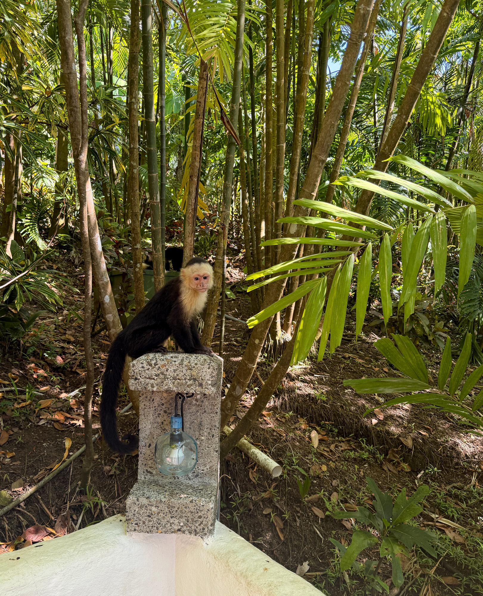 Hotel Costa Verde er lige så meget jungle som hotel. Det ligger på en stejl, grøn skråning over Stillehavet, og der gik cirka fem minutter, før vi havde set flere aber end mennesker. Hotellets motto er ”Still more monkeys than people” – og det passer! Små kapucineraber fór rundt i træerne, og dødningehovedaberne dukkede op i flokke og satte sig bare til rette over hovederne på os, som om vi var flyttet ind hjemme hos dem. Olivia elskede at se Hr. Nilsson’erne, når bare de ikke kom for tæt på. Rundt mellem planterne kom leguaner luntende med det helt særlige udtryk, krybdyr har, når de ser ud som om de ejer matriklen. Det gjorde de muligvis også.
